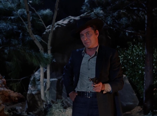 Seven Ways from Sundown came out only a few years after Barry Sullivan had taken leading roles in westerns such as Dragoon Wells Massacre and Forty Guns, but it more or less marked the end of his time in such headline parts and he would shortly embark upon a two season run on television playing Pat Garrett in The Tall Man and then drift into supporting/character roles. Perhaps I’m reading too much into it, but I like to think his actions in the last reel represent something of a redemptive sacrifice when he’s confronted with both the impact of his actions and the realization that he’s finally running out of road – this complements and builds naturally on the moment of dreadful guilt that washed over him earlier when he understood that he had taken the life of an old friend. Venetia Stevenson, daughter of John Ford favorite Anna Lee and director Robert Stevenson, is someone I remember most for Day of the Outlaw and the effective low budget horror movie The City of the Dead. She shares a few good moments with Murphy, particularly towards the end when she puts him straight on the danger posed by Flood’s recklessness and then becomes an unwitting catalyst for the tragic yet apt climax. John McIntire could generally be relied upon to provide a touch of class to any movie and he does so here as Flood’s former associate. It’s a quiet performance and quite a touching one.