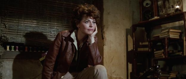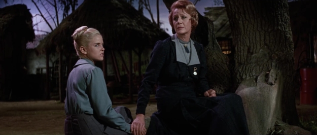 Ford’s films were always liberally sprinkled with grace notes, quiet and reflective sequences that served to bookend the more vigorous passages. In a movie which has been criticized for its visual modesty the violence and terror of the bandits’ assault is calmly foreshadowed by Bancroft and Albert gazing at an evening sky bathed in the boiling and throbbing flames cast by a neighboring settlement being put to the sword. Moments like that do not reach the levels of splendor which were attained in masterpieces such as She Wore a Yellow Ribbon, for instance, and it would be foolish to try to draw any such comparison. Nevertheless, within the context and framework of the movie before us there is still the classic Fordian human bonding on display. The same can be said for the scene with Andrews and Cartwright sitting below the tree in the courtyard in the wake of the cholera episode, a small moment of shared compassion that rounds out the characters. Even simple shots such as that of Cartwright drawing on a cigarette behind the shade of a mosquito net, separate, self-contained and lonely, are effective due to their quiet simplicity. Color is used sparingly but intelligently as well. So much of the movie is shot in subdued tones – the cool and severe blues and greys favored by Andrews and her fellow missionaries, the earthy browns of Cartwright. And then the climactic appearance of Cartwright clad in shimmering yellow, with that slash of crimson, a burst of positivity and passion emerging from the darkness as she prepares to sacrifice herself.
