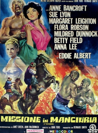 The on screen text informs the viewer that the story is taking place in the years before WWII, in 1935 to be exact, in a remote and far-flung region of China. In essence, it is the frontier, just not the frontier of the Old West that one so readily associates with Ford. Instead this is the Far East yet it is no less a frontier for being located there – it is still the edge of civilization, that untamed region where law is but a casual interloper at best. Officially, this should have been a time when the warlord era had come to close in China, but that’s not the case here. The specter of Tunga Khan (Mike Mazurki) hangs like a threatening storm over everybody’s head. The fear of pillage and atrocity is never far from the thoughts of the occupants of the evangelical mission run with clear-eyed determination by Agatha Andrews (Margaret Leighton). Despite this messianic zeal, there are deep and powerful undercurrents raging within the mission and its members. The one married woman present (Betty Field) is pregnant while approaching menopause and her ineffectual husband (Eddie Albert) is a dithering dreamer, while Andrews is waging a private war with her own sexuality and struggling against the temptation represented by her young assistant Emma (Sue Lyon). Into this increasingly tense atmosphere arrives the new doctor, the brash and worldly Cartwright (Anne Bancroft). Her unorthodox – at least from Andrews’ perspective – approach to life helps to raise an already simmering emotional temperature while an outbreak of cholera sees the balance of power begin to slide. However, the ultimate challenge, not simply to Andrews but to all of the denizens of the mission, will come when Tunga Khan’s rampaging bandits crash through the gates and take control.
