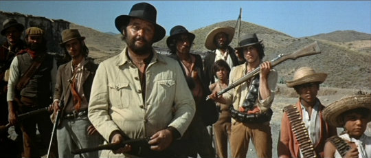 By contrast, Juan is a much more straightforward character, a simple man with simple dreams. However, he too has to suffer at the hands of idealism. He’s well aware of the hypocrisies and false promises held out by the revolutionaries, yet he allows himself to be drawn ever deeper into the machinations of John and Villega. His casual vulgarity and lack of sophistication mark him as a semi-comedic everyman, someone whose attachment to family allows the audience to sympathize with him despite his being a common criminal. By having the audience view proceedings mainly from Juan’s perspective, Leone manages to hammer home the abrupt shift in tone at the halfway point much more effectively. The fate of his extended family, a direct consequence of his greedy foolishness and unwitting embroilment in politics, hits both him and us hard. The scene in the cave, with a bewildered and grief-stricken Juan stumbling around amid the carnage, is extremely moving no matter how often it’s seen. It brings both the film and the character to a new level, and neither one is ever the same again. Juan is transformed form a gregarious rogue with grandiose plans first to an image of despair, and then to something harder and colder. As an actor, Rod Steiger generally had a tendency to overcook it, to chew up the scenery before moving on to the props for afters. That is certainly in evidence in the early stages, where he is essentially a caricature of a Mexican bandit. However, he was capable of greater subtlety when the occasion demanded, and his reaction to the discovery in the cave, and all that follows, bears testimony to that. Steiger managed to tap into the development of his character, the journey he has taken, but still hold onto a touch of the innocence that makes him endearing. The final fadeout, with Juan’s moon face staring dumbly into the camera lens as his question is heard and the answer flashes before us, underlines Leone’s feelings and highlights the pitiful quandary faced by all of us.