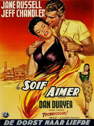 A desert highway, one of those arrow straight and seemingly endless thoroughfares that we viewers have traveled many times. Our companion on this occasion is a lone woman, Amanda Lawrence (Jane Russell), speeding along until she gets a flat tire. With no help available, she sets off on foot, burdened with what look like the assorted fripperies of a shopping expedition. There can’t be any doubt that this chic and carefully coiffed lady is very much an outsider in the primal landscape, a refugee from 5th Avenue cast adrift in the dust and heat of the southwest. Then out of that shimmering haze comes a jeep carrying two men – miner Jonathan Dartland (Jeff Chandler) and doctor Hugh Slater (Dan Duryea) – and we’re off. Amanda is clearly taken with Dartland and he’s at least interested in her.  What follows is a love story but it’s not a smooth one, and I think it’s questionable in the end what all of the protagonists are in love with. In fact, despite the relatively neat conclusion, those questions are only partly answered and I feel there’s a suggestion that they will rear their heads again.