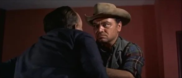 For a long stretch it appears as though the plot is going to chart a hard bitten course, Harris soon has the exuberance knocked out of him by the unforgiving nature of both the environment and his companions. The whole purpose of his trek across the border is shattered in one moment of appalling revelation, a moment which threatens to tip him into a pit of despair and bitterness that is deep and steep sided. Similarly, Reese spends much of his time indulging his cynicism and abrasiveness. To all intents and purposes, that dismissive diatribe quoted at the head of this piece starts to sound more and more like a summation of the myth-busting stall the film has set out. Yet it’s a deceptive impression, for the characters played by Lemmon and Ford respectively learn and grow as a result of their experiences and their effect on each other. Lemmon had a knack for essaying a unique type of passion and enthusiasm that often felt manic and brittle. He comes perilously close to cracking under the strain and the provocations that come his way, but he matures in the process and tempers his excesses in a way that transforms them into strengths. Ford’s destination is slightly different, but just as fulfilling for the character and the viewer too. His path is essentially one of rediscovery and renewal, the bluster and machismo discarded as he witnesses the negativity of his influence mirrored in the meanness that threatens to harden the heart and damn the soul of his youthful partner. In support Brian Donlevy plays it quiet and pensive in a way that he didn’t always get the chance to, a disillusioned gunslinger looking for a different kind of life. There’s something very moving about his ultimate fate, and it proves to be one of the prime catalysts spurring Ford’s epiphany. Anna Kashfi (Marlon Brando’s first wife) is the only woman in a very masculine movie and although her role is important for its impact on Harris in particular, she’s only in the film for a short time. Richard Jaeckel, Dick York, Frank DeKova and Strother Martin are among those who also provide telling little sketches that serve to flesh out the story.