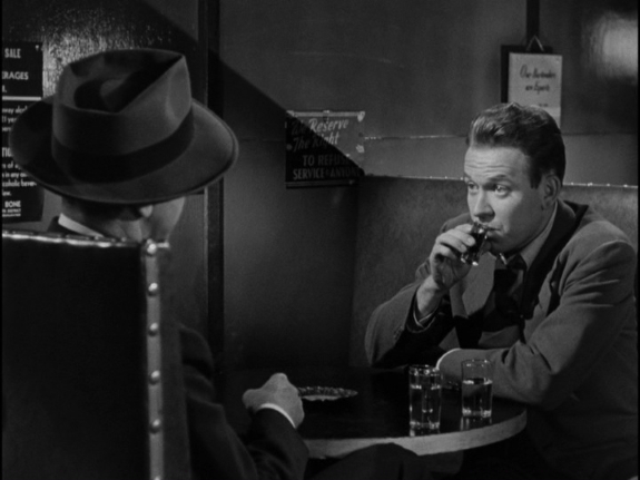 Cry Danger was the first movie directed by Robert Parrish. He’d served a long apprenticeship in the editing and sound departments and worked on a number of films for John Ford. By 1951 he was therefore in a strong position to take what he’d learnt and craft his own pictures. Cry Danger saw him off to an impressive start and he made a series of mostly good, and in a handful of cases truly excellent, films throughout the decade. This was also the first of four productions for Parrish where William Bowers was involved in the writing. And the script here is one of the strengths, tightly paced and twisty without becoming unnecessarily complex, it benefits from some marvelously snappy dialogue that catches the flavor of the hard-boiled idiom. Unlike a lot of films noir, there isn’t a great deal of overt social commentary. There’s not, for instance, much if any background provided for Mulloy, nothing to hint at how this man got himself tied up with bookies and crooks in the first place. The one concession to the consequences of life in the post-war world is the portrayal of Delong. This disabled veteran makes only the briefest reference in passing to the loss of his leg, but there is a suggestion that his prodigious drinking has its roots in that injury. A good deal of that too is treated in a light and offhand manner, though there is one point where the possibility or advisability of his trying to quit is raised. The wistful look, one tinged with a shadow of desperation, that passes over Delong’s face alludes to some inner suffering. Nothing much is made of this but it is there for the viewers to take on board should they wish to do so.