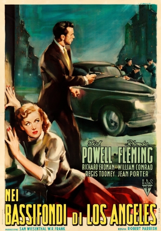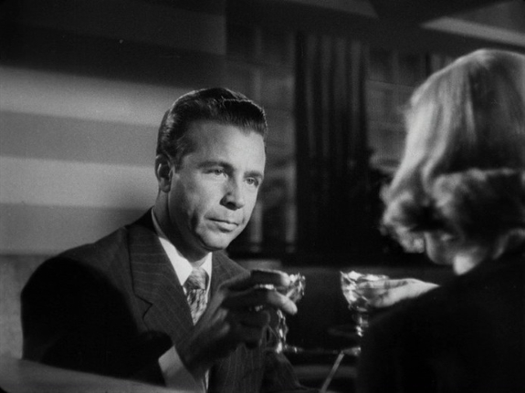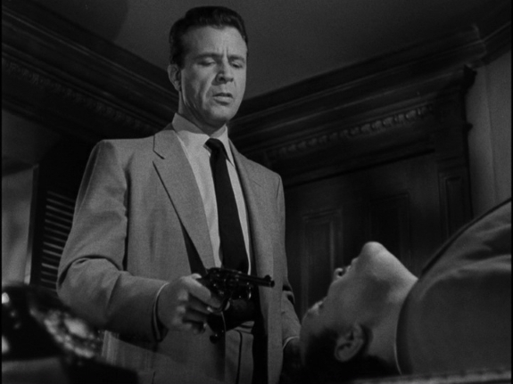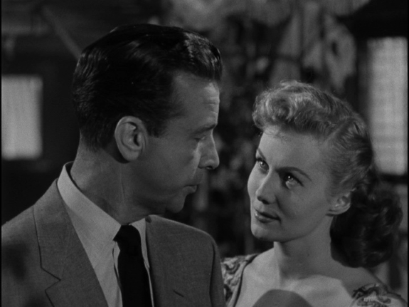 Johnny Forbes (Dick Powell) is a man who ought to be happy with his lot in life. He’s got a devoted wife (Jane Wyatt) and a bright young son. He’s got what appears to be a successful career in insurance and lives in a neat and attractive suburban home. What could be better than waking up to a breakfast that has been prepared and laid out before him, with his family around him, the sun pouring through the window and the promise of another relatively carefree day ahead. That’s how it should be, but the pain of predictability is etched into the hangdog features of Johnny Forbes as he contemplates it all. Both his demeanor and his conversation betray a man ripe for rebellion, a guy who has wearied of respectable averageness, of being part of the backbone of society. Such a man is just a step away from recklessness, he’s practically sleepwalking into peril. A visit to an embezzler’s ex in order to see how much can be recovered is all it takes. The ex in question is Mona Stevens (Lizabeth Scott), a model in a dress store. The hook that snags Forbes comes in the form of a trip to the marina to see the boat Mona’s boyfriend bought her with the money he stole. Just a smile from the girl and then a quick ride in the speedboat are enough – Forbes is soon asking her out for drinks, and it doesn’t take much imagination to realize where all this is heading. The affair itself only goes so far though, and not necessarily due to any moral qualms on the part of Forbes at this stage. A bigger issue is the fact that the private eye employed by the insurance firm to track down Mona Stevens in the first place (Raymond Burr) is besotted with her to the point he not only roughs up Forbes, but is also prepared to destroy anyone who stands in the way of his desires.