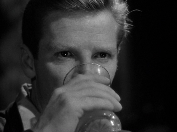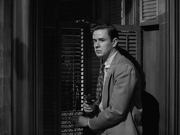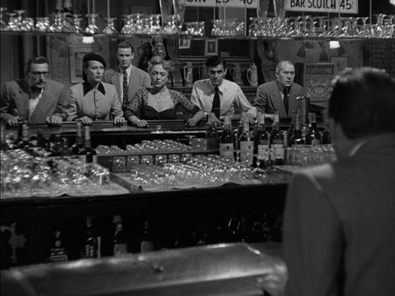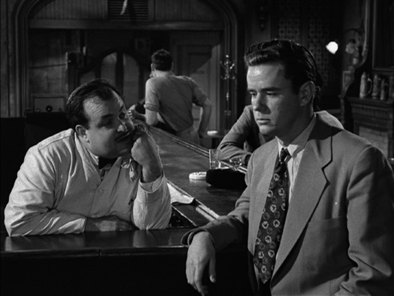 The viewer has already seen what Wyckoff is capable of since it’s been made clear that he’s on the run from a psychiatric hospital and we’ve seen him calmly shoot down a bus driver just because he got in his way. While we catch glimpses of the lives of the others in the bar, in addition to those mentioned there is also the alcoholic good time girl (Virginia Field) and the expectant first-time father (Keefe Brasselle), the TV in the background starts to broadcast news of a fugitive who has just killed a man. As the bartender grows uneasily aware that this killer looks a lot like the neurotic young guy who is stationed at the far end of the counter, we too have realized that the situation is poised on a particularly sharp knife’s edge. Before long more violence takes place and a state of siege develops with Wyckoff barricading himself and his ill-starred hostages in the saloon while the police wait outside and weigh up the pros and cons of allowing the killer’s shrink in to talk to him.