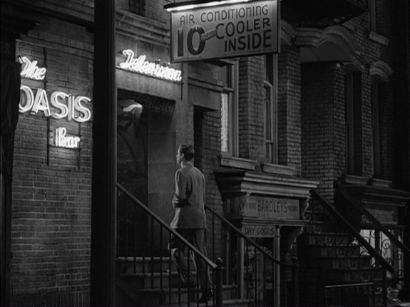 Think of an oasis and the notion of growth and fertility, of life itself, tends to spring to mind. It’s the name of the bar in which perhaps 90% of the action in Dial 1119 takes place, though this particular bar is in reality something of a dead end in more ways than one. Aptly enough, one of the first characters we see is a reporter (James Bell) who has arrived at the weary middle-aged conclusion that his job has indeed led him up a blind alley, that the place he’s at is all it’s ever going to be. He talks of quitting, of throwing in the towel on the whole business, but as a colleague tells him he’s not really serious about it, and payday is just around the corner after all. No, he decides to go round the corner, in a manner of speaking, and drop into his local bar for a drink on the way home. And there’s the woman (Andrea King) drifting toward the dispiriting prospect of spinsterhood at the ripe old age of 28. She’s getting ready to try to stave off that blank future by heading out to meet a man (Leon Ames), although she tells her (off screen) mother that she’s going away on a trip with a girlfriend. She too is headed for that same bar. Then there is the bar itself, a walk up place that claims to offer all the luxuries of the day, from air-conditioning to one of those newfangled TV sets. It’s a dour spot though, with a barman going by the name of Chuckles (William Conrad) who looks like he’s not cracked a smile since he grew his first tooth and who carps about the cheap clientele he’s saddled with. As the small group of customers drifts in and sets about tackling whatever drowsy numbness dulls their particular senses another joins them, an intense young man called Gunther Wyckoff (Marshall Thompson).