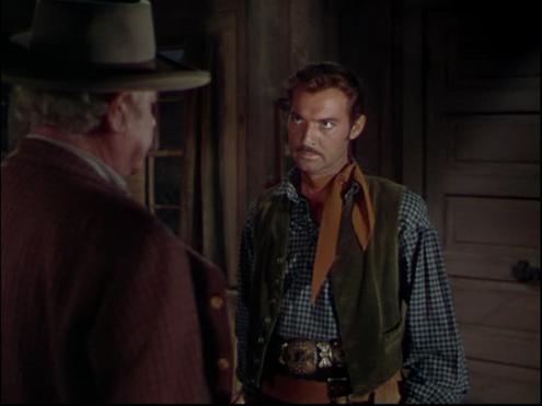 Leaving that aspect aside, what we have is a pretty straightforward quest for justice yarn as pistol salesman Steve Farrell (Randolph Scott) finds himself not only robbed of the guns he’s been promoting, but also accused and imprisoned as an accomplice of the man who stole them. That man is Jason Brett (Zachary Scott), an ambitious sociopath who sees his new acquisitions as a handy means of obtaining the money and power he covets. The plot is essentially the story of Farrell’s determination to get the guns back and restore his own reputation. Along the way, he will encounter a weak-willed miner (Lloyd Bridges), his tough and resourceful wife (Ruth Roman), and a corrupt and dissembling sheriff (Alan Hale).