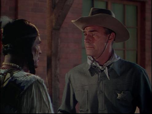 I don’t believe I’ve seen a film by Joseph H Lewis that wasn’t interesting, either in terms of theme or the visual language he employed in the telling. Although the plot of A Lawless Street isn’t especially original, the way Lewis goes about presenting it elevates it all considerably. Apart from one brief sequence, the entire movie plays out within the confines of Medicine Bend, with all the significant events taking place indoors. The director, and cameraman Ray Rennahan, creates a look and mood which approach film noir at some points and contain a fair amount of symbolism. The image below is, of course, a notable example — the wounded Ware hiding out in his own jail, the shadows of his past and his sense of duty pinning him in place just as surely as the shadows cast by the bars. Note too how the real man seems small and tense next to the solid and imposing image of himself. In fact, a great deal of this film is concerned with the concepts of illusion and reality; one of the main sets is the theater where Tally performs, and what is the theater if not a palace of illusion. As Tally plays her role on the stage, and the marshal assumes his watching from the box seat, the reality is only shown when they move backstage. In the same way, Ware’s office represents his “backstage”, the sanctuary which allows him to strip away the greasepaint of invincibility. Also, let’s not forget the notion of rebirth, the allusion to spirituality, which is frequently found in 50s westerns. The climax toys with the idea of resurrection, of a man back from the dead to reclaim his position in society, and by doing so attaining the spiritual and emotional equilibrium for which he’s been yearning.