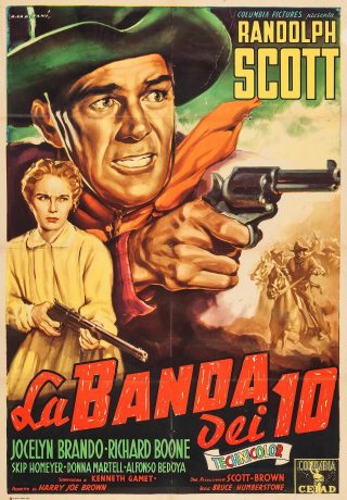 Western movies whose plots revolve around range wars are legion, that collision of ambition, greed and vanity providing storylines and thematic possibilities that are ripe for exploitation. When a little extra spice in the form of romantic rivalry or sexual obsession is added to the mix, it’s not unreasonable to think that what is finally served up will be even more tantalizing. Such is the case with Ten Wanted Men, where after an exciting and tense yet ultimately deceptive opening, the character of John Stewart (Randolph Scott) is introduced. He’s just had a harmless laugh at the expense of his greenhorn brother (Lester Matthews) and nephew Howie (Skip Homeier). Stewart is a big man in the territory, and the lavish party he is hosting is a testament to his generosity and largesse. As this is a fairly quick moving picture not much time is wasted in presenting the main source of conflict which will carry the viewer through till the climax. This is embodied in the person of Wick Campbell (Richard Boone), a neighbor of Stewart’s and a rival for the right to dominate the land.